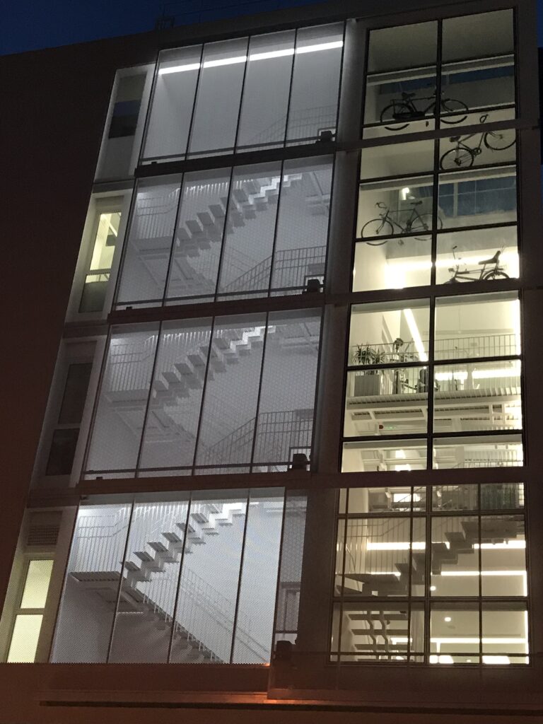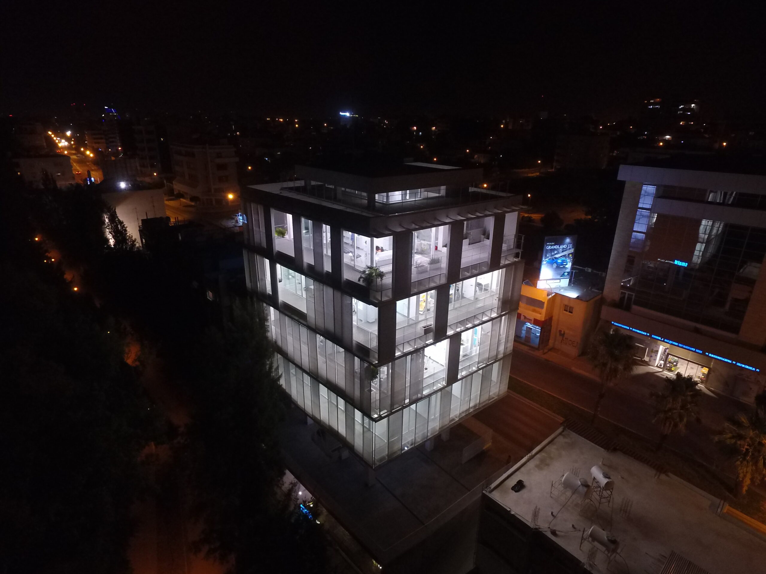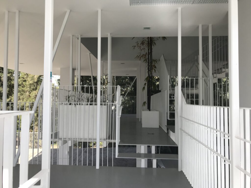 The dental clinic “Smalto” is located along Strovolos Avenue, next to the Pediaios river, connecting the city with the area’s linear park. The building is elevated, freeing the ground floor for pedestrians. Access is provided through stairs and pathways that seems to be park extension. Areas are open and flexible, with varying heights and small internal courtyards. The perforated, movable façade regulates natural light and creates shifting patterns of shade, while at night the building is illuminated, standing out within the urban landscape.